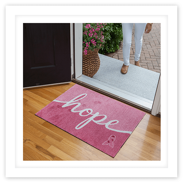 Refresh your entry way with the “Heartfelt Hope” pink ribbon welcome mat. CarpetOne mats are durable, machine-washable and made in the USA.