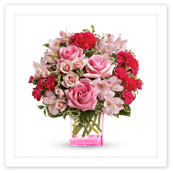 Pay tribute to the fearless female in your life with a beautiful mixed bouquet featuring pink roses arranged in a perky pink cube.
