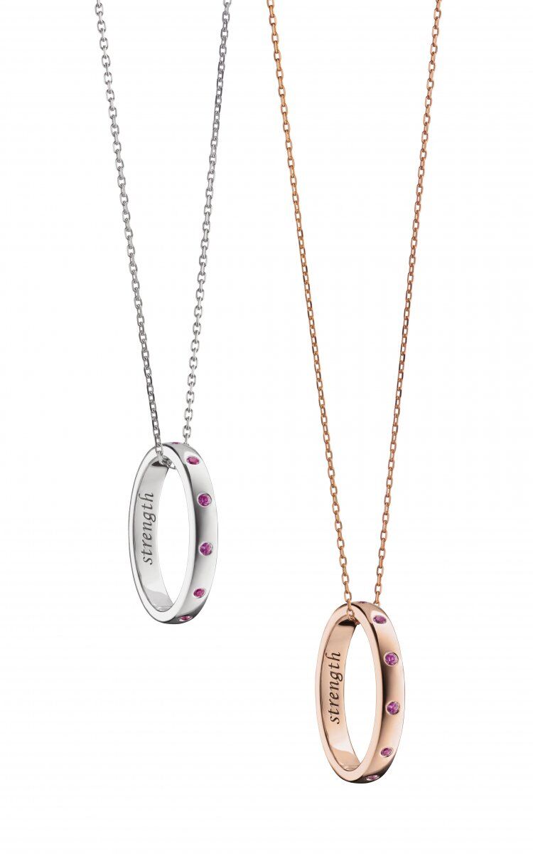 This year, we are thrilled to welcome Monica Rich Kosann to the BCRF partnership family. Designed to make a statement, The Monica Cares “Strength” Poesy Ring Necklace is available in either sterling silver or 18K rose gold, both with pink sapphire (.12 carats).