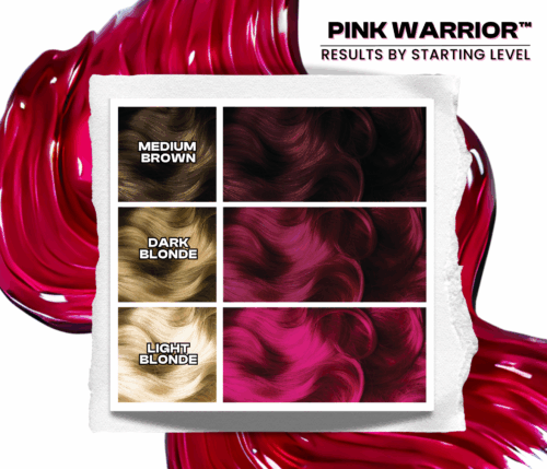 Pink Warrior™ is a medium electric pink shade with cool undertones and bold cyberpunk energy, and it is highly pigmented and high-impact, resulting in a bright electric pink that glows under blacklight on light blonde or pre-lightened hair, and deepens into cooler, saturated pink tones on unbleached medium or dark hair.