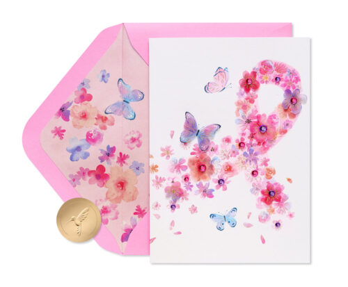 Let a cherished friend know you’re thinking of them with this exquisite Papyrus card, featuring a delicate floral and ribbon design accented with radiant foil and sparkling gems. The artistry of the butterflies and flowers creates a touching symbol of friendship and care. This 5 x 7 inch card opens to a blank space, inviting you to pen your personal thoughts and sentiments. Each card comes with a premium pink envelope, ensuring your message arrives in style. Premium lined envelope with unique Papyrus gold seal included. Extra postage may be required. Only from Papyrus.